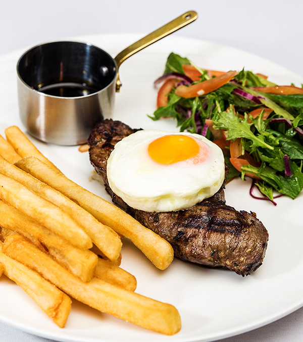 - Steak, Egg 'n' Chips - New Zealand Angus sirlion steak, egg, fries, garden salad and jus