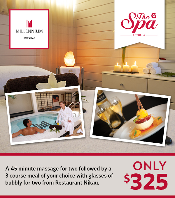 The Spa & Restaurant Nikau join forces to bring you this massage & dining treat! Enjoy a 45 minute Pure Relaxation Massage each at The Spa. Continue in Restaurant Nikau starting with a glass of bubbles followed by a 3 course dinner of your choice.