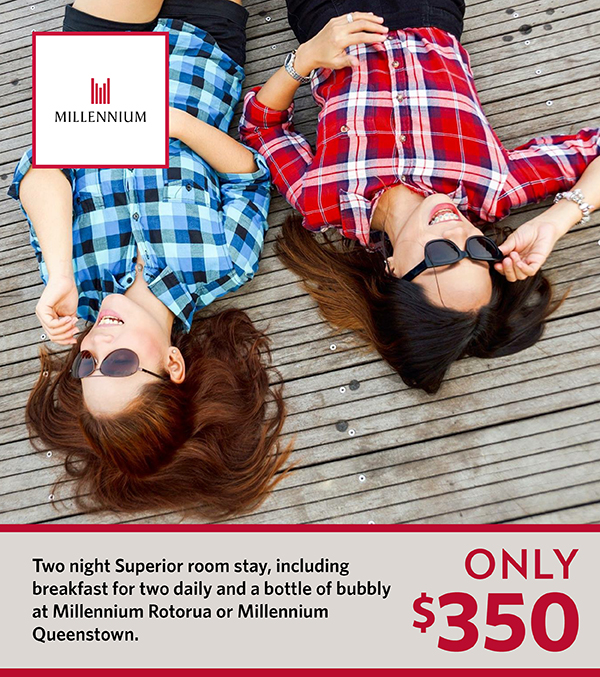 Treat your best friend or someone special to a two night break right in the Millennium Hotel Queenstown or Rotorua . This gift voucher entitles two adults to enjoy a two night stay in a Superior Room and includes breakfast for two daily, plus a bottle of Brancott Estate Brut Cuvee on arrival.