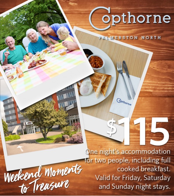 Treat someone special or yourself to a long weekend break in Palmerston North at the Copthorne Hotel Palmerston North. Valid for Friday, Saturday and Sunday night stays, two people can enjoy accommodation with cooked breakfasts each morning of stay.